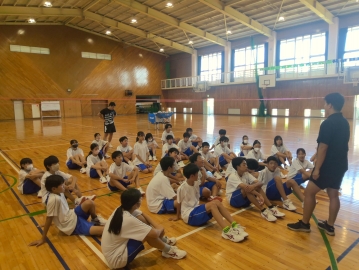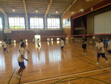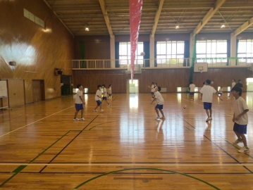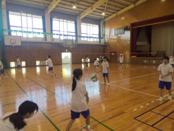1年生の体育はバレーボールです。アンダーハンドパスの練習では最高回数を競っています。また、オーバーハンドパスの練習は、体育館を横断するようにビニールテープを張り、生徒全員がネット越しのパス練習ができるように工夫しています。