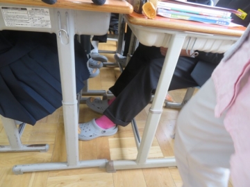 子どもたちは、胸にピンクのペンを差したり、中にはピンクの靴下を履いたりして、いじめを許さない気持ちを表しました。