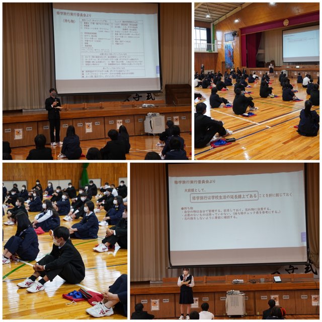 実行委員会からの細かいルールや、ホテルの鍵の管理の仕方、点呼の方法など、さまざまなことを確認するために学年集会をおこないました。実行委員会が作ったルールをしっかり守った中で、全力で楽しめるよう協力できるといいと思います。
