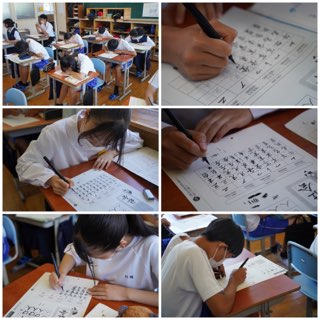 国語の授業で筆ペンを使い、丁寧に字を書いていました。暑さに負けず、集中して頑張っていました。
