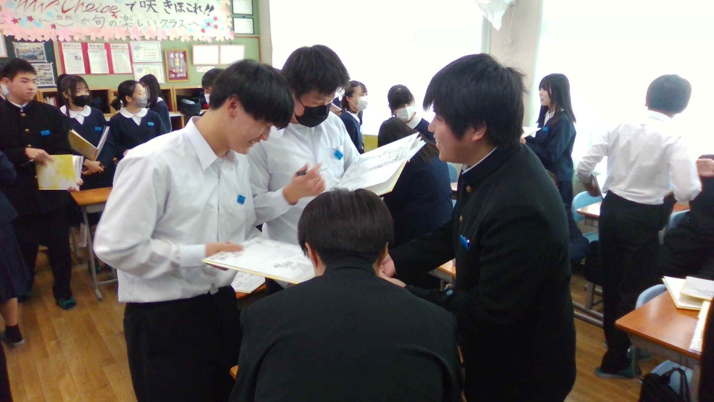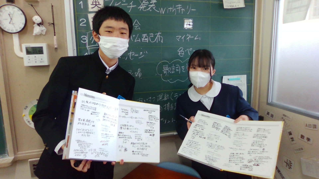 今日、卒業アルバムを配付し、メッセージ記入の時間を取りました。配った瞬間から写真を眺めていて、写真の場面を見て懐かしがったり、笑いあったりする姿がありました。学級の枠を越えて、みんなで記入している様子は、とてもよい雰囲気でした。