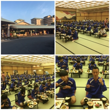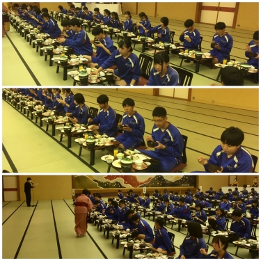 広い大広間で、一斉に同じ方向を向いて黙食です。