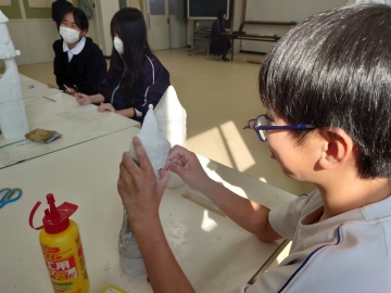 美術創作部では、それぞれが創作意欲のもと作品を作っています。今、部員は幾何学模様のデザイン画、紙粘土でつくる塔、木製のパズルなどを制作しています。