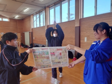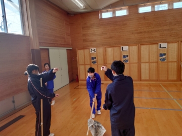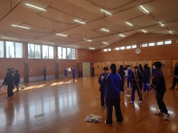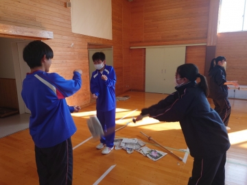 必殺仕事人のテーマを流しつつ、竹刀で新聞紙を一刀両断するというミッションに取り組んでいました。