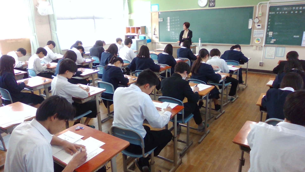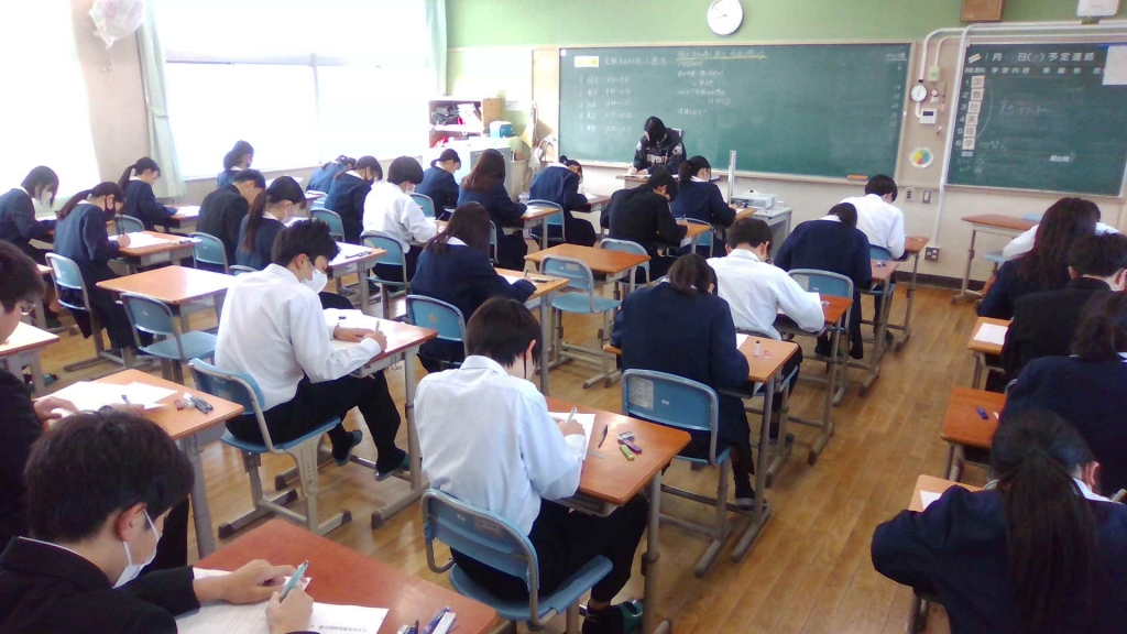 今日の3年生は、普段の授業とは打って変わり、教室は静かで、紙をめくる音とペンが進む音だけが響いています。中学校で最後の実力テストに、集中して臨んでいます。