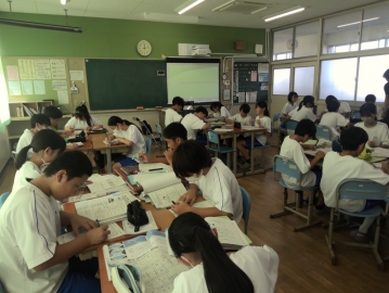 理科の授業では、中間テストが終わり振り返りをしています。今回のテスト範囲の「光の屈折」について生徒たちは班で協力して、学習内容をレポートにまとめています。