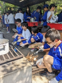 野菜を切る人、竈に火をくべる人、それぞれの役割をしっかりとこなしています!