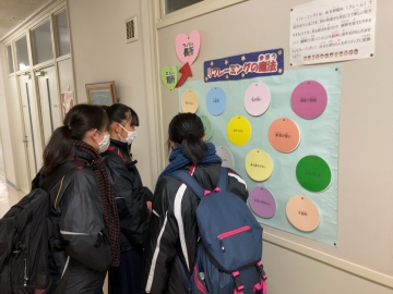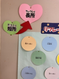 朝、相談室前の談笑の様子。 生徒A:「Bは、怒りっぽいよね。」 生徒B:「え~?! まあそうかなぁ。」  生徒C:「『感情表現が豊か』だって。」 生徒A:「そう、豊か!豊か!」 生徒B:(にっこり ☺)ほほえましいでしょ。 |