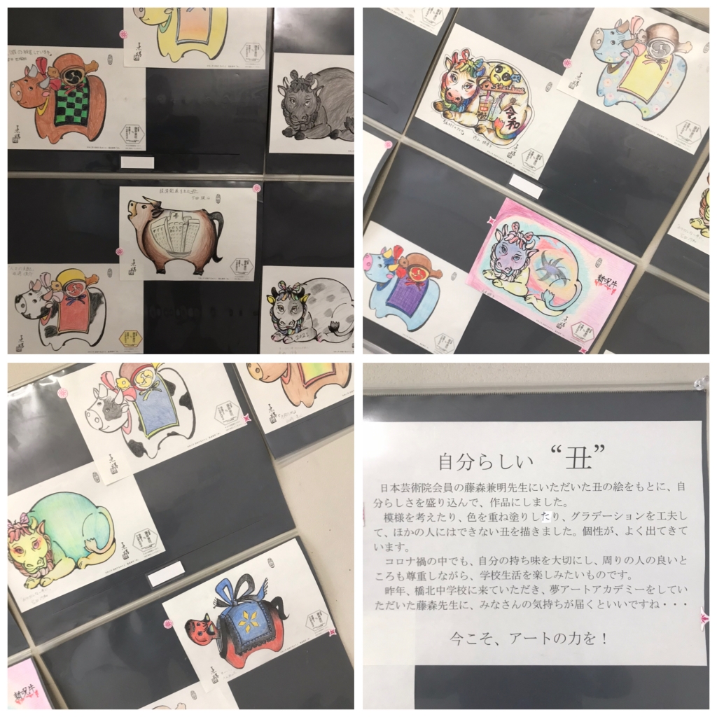 一階展示コーナーに,今年の干支である「丑」が描かれた素敵なカードがたくさん張り出されていました。おもわず、立ち止まって見入ってしまいました。