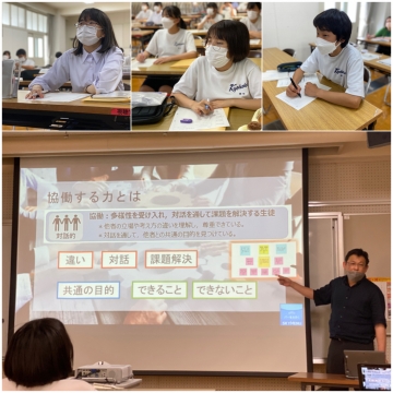 今の中学生が生きていくことになる Society 5.0 の世界。「みんなと同じ」よりも「みんなと違う」ことが強みになる世界です。その中で、違いを大切にする=自分の得意を活かすことから「自律」が生まれ、様々な違いを持った人が集まるから「協働」できる。そして、そこから新たなものを「創生」することが可能になる。その力をつけるためにどんどん挑戦をしていこう。そんな校長先生からのメッセージを受け取って、生徒は前向きな気持ちがみなぎる様子でした。