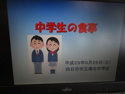 本日の6限目は栄養教諭の方に来ていただき,「中学生の体の成長と食事の仕方」について学習をしました。中学生は成長期であり,エネルギーの必要量が多い時期であることを知り,一汁三菜を中心に,栄養のバランスを整えることの大切さを学びました。特に「まごは(わ)やさしい」の頭文字の食物が不足しやすいと教えていただきました。また,朝食を食べることの大切さも知ることができました。毎日朝食をしっかりと食べて登校しましょう。