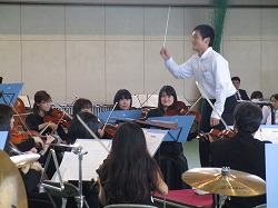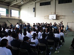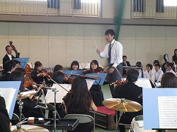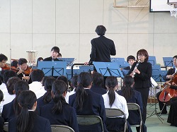 本日、体育館でセントラル愛知交響楽団よる「学び舎音楽会」が開催されました。古谷誠一さんの指揮のもとモーツアルトからベートーベンまで、素晴らしい音色を聞かせていただきました。音楽会の中には、指揮者体験コーナーがあり、代表生徒と代表教師がオケの指揮をしました。自分の指揮の通りに音が流れ、心地よさそうにタクトを振っていました。また、音楽部との共演も行われ、部員も実力以上の音を奏でることができました。そして、オケの演奏での「校歌」と「群青」の合唱では、今までにないハーモニーに体育館全体が震えました。生徒たちの心に強く残る音楽会でした。