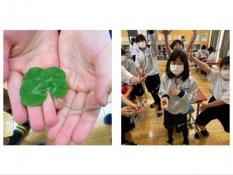 理科の時間に校内の植物観察をしていた1年生。 なんと四つ葉のクローバーを発見! みんなで大喜び。いいことありそうですね!  |