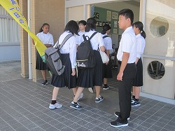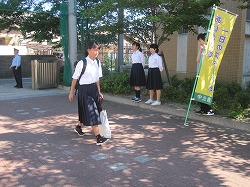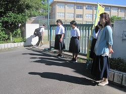 6月のあいさつ運動を行いました。生徒玄関、クラブハウス前、体育館前の3か所に分かれて、生徒会あいさつ運動実行委員のメンバーが、登校してくる生徒に「おはようございます」と声をかけました。梅雨とは思えない晴天のもと、互いに朝のあいさつを交わしてさわやかに一日がスタートしました。