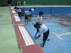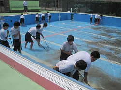 体育の時間にはプール掃除をしました。プールの壁面や底をデッキブラシなどでこすりました。水の中にはオタマジャクシやヤゴなどの姿も見られました。