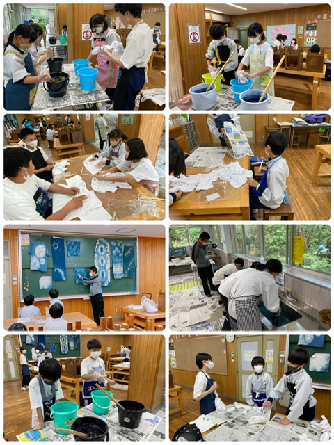昼食を食べ、角間先生のご指導のもと、藍染めTシャツづくりをしています。