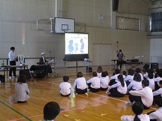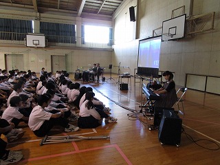 歌や音楽を交えて絵本を読んでいただき、生徒たちは食い入るように見つめていました。