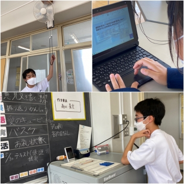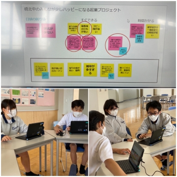 橋北中学校のみんなを少しハッピーにするにはどんな事業がよいかをテーマに、日頃のちょっとした困り感を出し合いました(教室の中を見回して、困り感を考える姿も・・・。)