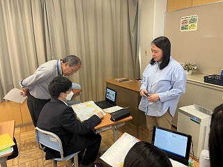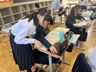 先日の全体研修会に引き続き本日2限目、今度は1年生の地理的分野で「自己選択学習」が行われていました。自分の行ってみたい国は何州でどこの大陸かを調べる学習でしたが、地図帳で調べる生徒、ネットで調べる生徒、友達と相談する生徒と様々な形の学習形態が展開されていました。まだ入学して日の浅い1年生ですが、今後はより多くの選択肢から適切に学べるように力をつけていきましょう。