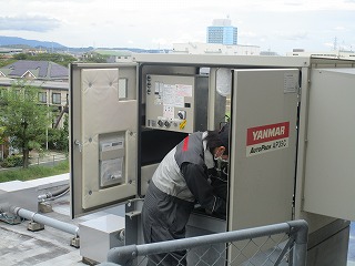 そんな中、本日は松岡産業の方に屋上発電機の点検に来ていただきました。