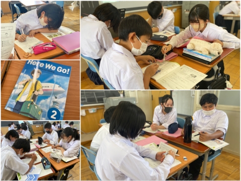 2年生の英語の時間、考えて、話し合いながら課題を解いています。