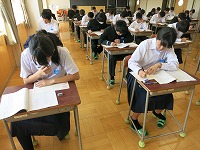 本日、3年生は、全国学力学習調査に取り組みました。今回は、国語A(主に「知識」に関する問題)、国語B(主に「活用」に関する問題)、数学A(主に「知識」に関する問題)、数学B(主に「活用」に関する問題)と生徒質問紙を行いました。生徒の皆さんは、頭を悩ませながら問題に取り組んでいました。