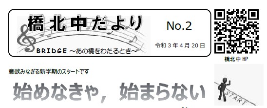 本日、『橋北中だより№2』をお子様を通じて配布させていただきますので、是非ともご一読いただきたいと思います。