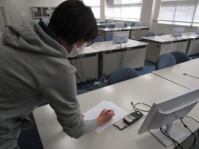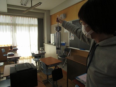 今日は、学校薬剤師による空気検査と照度検査がありました。空気検査では、二酸化炭素や湿度などを検査していただきました。照度検査では、明るさだけではなく眩しさも検査していただくなかで、1年教室の窓側について、眩しさがあったため、照明の調整をすること。またカーテンを使用する場合は、暗幕カーテンは換気が十分にできないので、黄色のカーテンの方が望ましいなど具体的に教えていただきました。