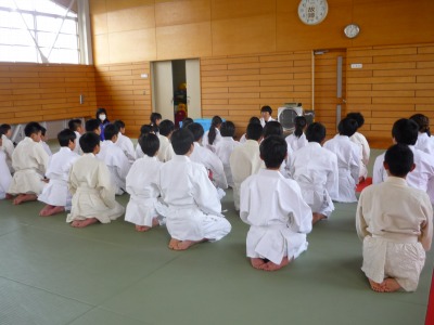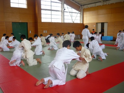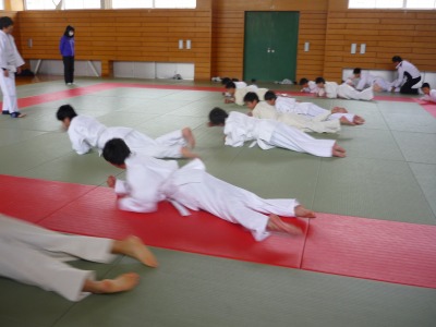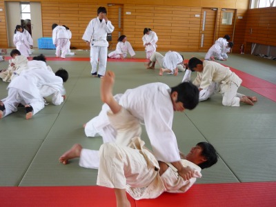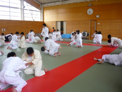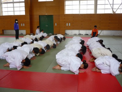 先週から1年生の体育の授業は柔道に取り組んでいます。まずは胴着を正しく着て,正座をするところから始まります。そして,立ったり座ったり礼をしたりというような基本的な動作を覚えます。その後,ほふく前進や前転をして畳の感触に十分慣れた後,膝をついた姿勢で相手の背中を畳につけるというゲームをしました。何もかも初めての武道ですが,生徒たちはとても楽しそうに取り組んでいました。今後も安全に楽しく進めていきたいと思います。