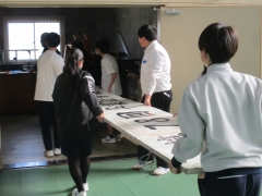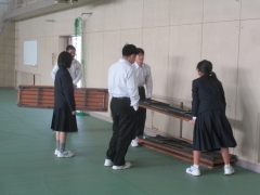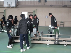 昨日の卒業式を終え、3年生35名が巣立ったこともあり、少し静かな橋北中の朝です。また、卒業式の翌日ということもあり、朝から1・2年生が体育館の片づけをしています。昨日、卒業式が終わってから、1・2年生で、舞台やピアノなど大きなものと、白布や旗、放送機器などの細かいものは片づけたので、今日は机と椅子、シートと看板の片付けになります。3年生が卒業し、4月からは、2年生が最上級生、1年生は1つ先輩の学年になります。今日の片付けの中でも、自分たちが学校の顔になる、学校を引っ張っていくという思いが感じられる場面や姿がありました。