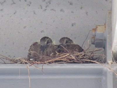 そんな月曜日の朝、この春に、職員入り口付近に作られた鳩の巣から、2羽の雛たちがひょっこり顔をのぞかせていました。そろそろ巣立ちの時期が近づいているのかもしれません。