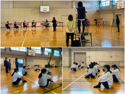 本校体育館に撮影クルーの方達が来てくださり、音楽部の演奏を録画中!