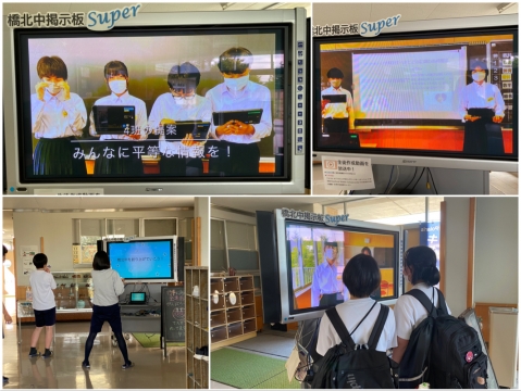 今年度から生徒玄関に電子黒板が設置され、動画が流れています、ICTを活用して、生徒会や各クラスでの取組、授業で作成した作品などを放送しています。今は、第2回生徒議会からのお知らせ、アメリカカリフォルニア州ロングビーチ市スタンフォードミドルスクールとのビデオ交流動画、こども家庭庁提案などが流れています。ぜひ見てね!