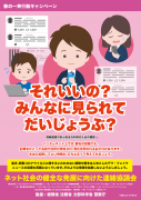 ネット社会の健全な発展に向けた連絡協議会は、ネット上の誹謗中傷など他人を傷つけるような書込み・拡散の防止のための啓発に取り組んでいます。 「最近、新型コロナウイルスに関するいわれのない誹謗中傷をはじめとしたデマ・フェイクニュースの流通も問題になっています。そのような情報を拡散しないようにしましょう。」 春の一斉行動キャンペーンポスター → ここをクリック |
