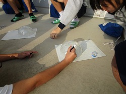 今日、3年生は太陽の1日の動きを調べるために、朝から透明半球を使って太陽の位置を記録していました。1時間ごとに透明半球に点を取り、それを繋げると透明半球上に太陽の動いた軌跡が描かれます。それを利用して太陽の動く速さや南中高度の学習をします。しかし、昼前後から雲が太陽を覆い、雨が降り出し、途中で中止となりました。また、2年生では、直列回路と並列回路の電流の大きさを電流計で測っています。1年生では、物質の融点を調べる実験を行っています。実物を見たり、実際に行ったりすることで学習理解が深ります。