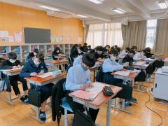 国語では、漢字の問題集が配られ、真剣に取り組む姿がありました。生徒から「あと5分練習したい」との要望。手が痛くなっても集中して練習していました。英語では、自己紹介を英語で行っていました。みんなが発表者に向いて聞いています。そして、一人が終わるたびに拍手が起こっていました。