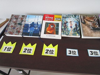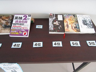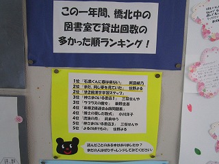 昨日から、生徒昇降口付近で橋北中でこの1年間に貸出回数の多かった図書の紹介がされています。