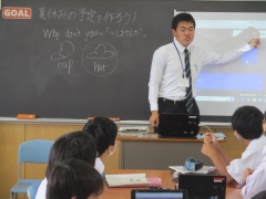 夏休みの予定を英文で作成する内容でしたが、2年生の生徒たちは、グループワーク、ペアワークともに積極的に授業に取り組んでいました。