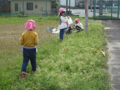 今日、中学生が全国学力学習状況調査やみえスタディチェックのテストを受けている時間帯に、こども園の5歳児がプール周辺の草むらに散歩に来ました。