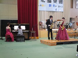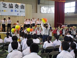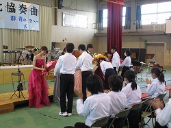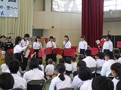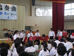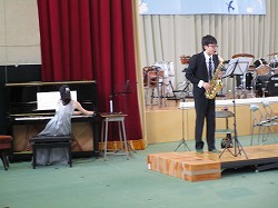 午後の部は、名古屋音楽大学の学生によるフルート・アルトサックス・ピアノによるミニコンサートから始まりました。奏でる音が心地よく、演奏者の世界に入り込んでしまいました。そして、ラストは音楽部の演奏です。アンサンブルコンテストの「スコットランド民謡ファンタジー」を皮切りに全8曲を演奏しました。その中には、先生たちの歌声が響いた「アニメソング」、名古屋音楽大学の学生とのコラボ「風になりたい」「情熱大陸」、特に「風になりたい」では、幼稚園児と有志生徒によるダンスも加わり大賑わいでした。「アンコール」の声がかかり「シングシング」軽やかに演奏し、成長した姿を見せてくれました。閉会式では、3年生が合唱コンクールの優勝とともに三泗音楽会の切符を手にしました。最後に、生徒会副会長から「今日の文化祭、お疲れ様でした。」の言葉で文化祭を終了しました。本当に内容の濃い、文化の香りがたち込める文化祭でした。