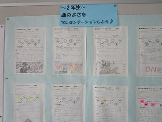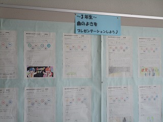 音楽室前を取りかかると、業務アシスタントの原田さんが、2,3年生の「曲のよさをプレゼンテーションしよう」という作品を掲示してくれていました。