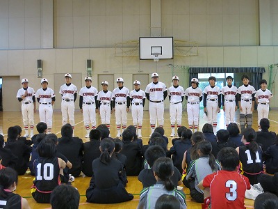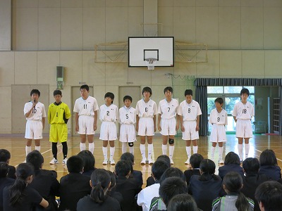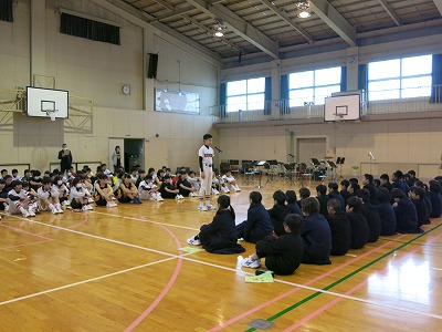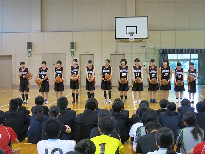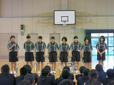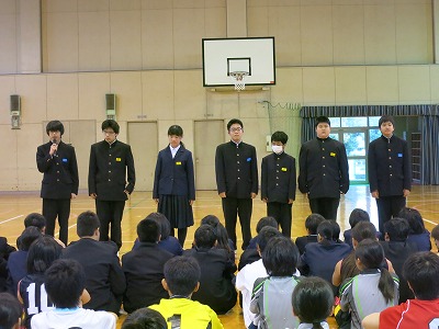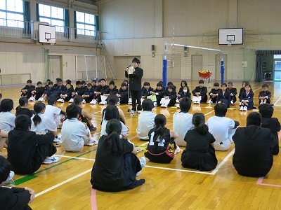 1限目は対面式です。生徒会の役割や各委員会の仕事を生徒会役員から説明した後,各部活動の紹介をしました。どの部活動も新入部員をよりたくさん確保しようと,練習のようすを再現したり,初心者でも大丈夫なことをPRしたり,工夫して発表していました。最後に全員で校歌を歌ってしめくくりました。これで1年生も橋北中生徒の仲間入りです。先輩たちと一緒によりよい橋北中学校を創りあげていきましょう。