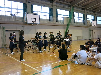 橋北中の生徒が耳傾ける 橋北交流会館で学び舎音楽会