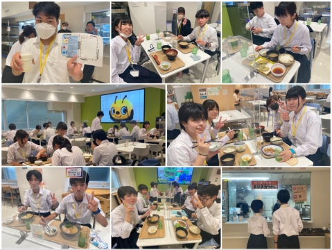 日本の食のまん中といえば農林水産省。こちらの食堂で旬の国産食材を使った食事をいただきます。やっぱり新鮮な食材が使われたごはんはおいしい!農林水産省の取り組みをスクリーンで学びながら味わっています。「牛乳飲み比べ」キャンペーンも実施中で、早く食べ終わった人は参加し、意見を提出しました。