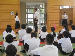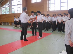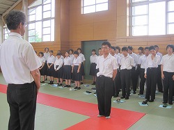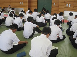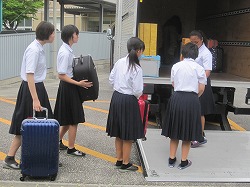 3年生は明日からの修学旅行に備え、午前中、武道場で事前指導を行いました。忘れ物がないか荷物チェックをした後、荷物をトラックに積み込みました。しおりを見ながら注意点を再確認し、実際に隊形の移動や平和セレモニーの練習をしました。明日から天候が少し心配ですが、「学びの総決算」のスローガンにふさわしい3日間にしていけたらと思います。