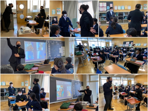 A new ALT, Orion, came to the first grade English class. Orion is from San Diego, USA. He told us about his family, hobbies and so on in English, and answered questions from students. After him, the students introduced themselves to him. They were able to tell in English what they had prepared to introduce themselves when they met Orion. They seemed to be very happy to be able to talk in their own language.