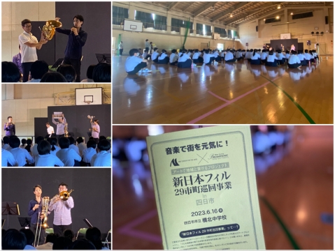新日本フィル29市町巡回事業 in 四日市 アートで地域とつながるプロジェクト 1年1市町とタッグを組んで、音楽で街を元気に!をコンセプトにここ橋北中にも来ていただきました。プロの演奏を聴いて、うっとり。音楽部の生徒は演奏することの難しさを知っているので、より引き込まれていました。