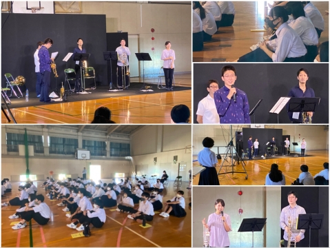 期末テストを終えた午後は、アートの時間。なんと東京を拠点として世界で活躍する新殷洪フィルハーモニー交響楽団金管五重奏の演奏者の方々が橋北中に来てくださいました。