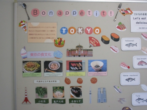 職員室と生徒昇降口の間にある食育の掲示板、Bonappetit!(ボナペティ)。3年生の修学旅行が近づいてきたこともあり、東京の食文化や江戸の伝統野菜の紹介を、栄養教諭の井原先生に掲示していただきました。食を知ることで、その地域の気候や産業、歴史を知ることができます。ぜひ、立ち止まって、見てみましょう。