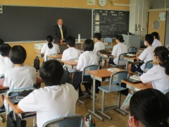 今朝、2年生の教室で、本の贈呈式が行われました。東新町第三自治会の阿部自治会長から、「14歳からの哲学」という本を、2年生34人全員に寄付をしていただきました。